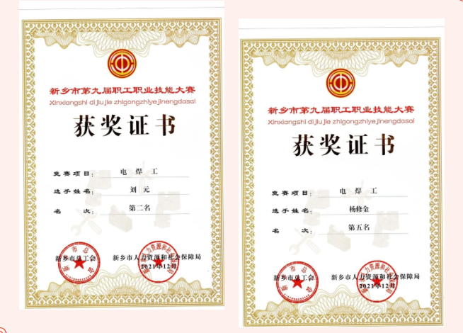 2022年2月新鄉市第九屆職工職業技能大賽評選活動參賽結果公布,我公司焊接班組員工劉元、楊修金分別榮獲第二名、第五名榮譽稱號。